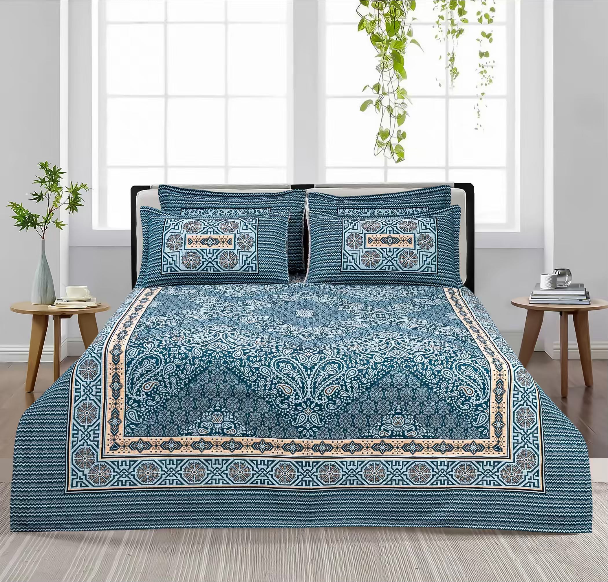 The Wirsa 4 Pillow Multani Bedsheet Set is tailored for a single and king bed and includes pillow covers, showcasing traditional Multani designs. Expertly crafted from high-quality fabric, it delivers durability, comfort, and a refined look. This set combines cultural heritage with practical usability, making it a sophisticated addition to any bedroom setting.