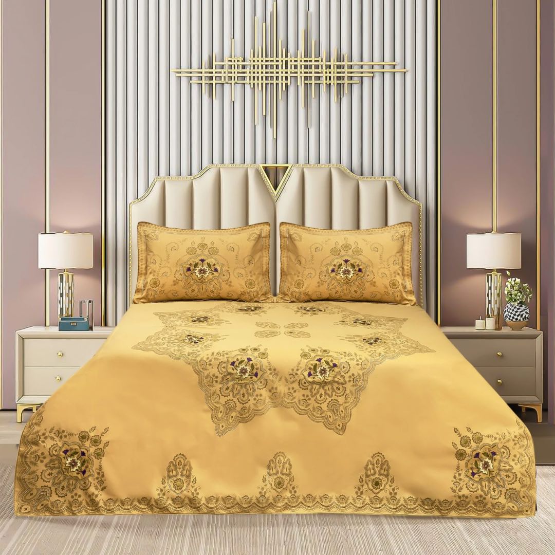 Cotton Embroidery Bedsheet Set combines premium cotton fabric with detailed embroidery, delivering a balance of durability and sophisticated design. This breathable bedding set offers lasting comfort while enhancing bedroom aesthetics, making it a practical and stylish choice for everyday use.