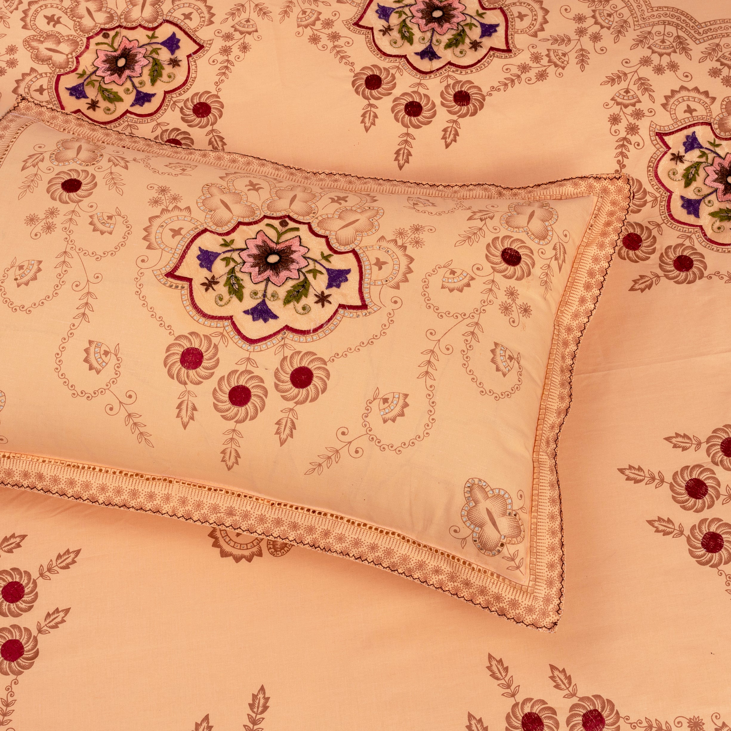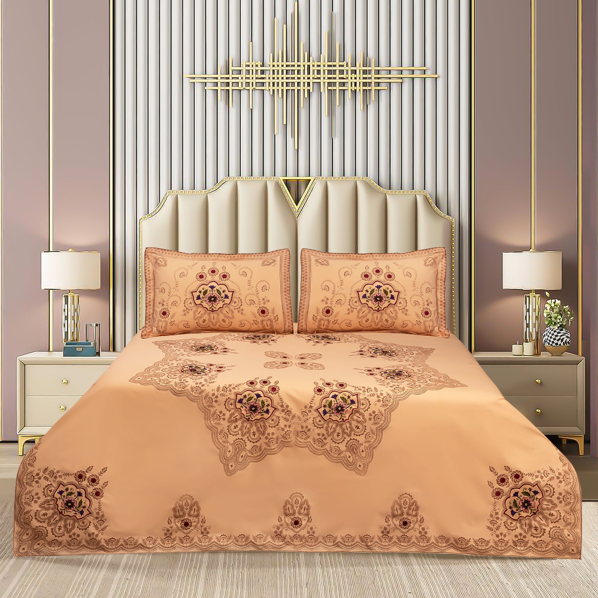 Cotton Embroidery Bedsheet Set combines premium cotton fabric with detailed embroidery, delivering a balance of durability and sophisticated design. This breathable bedding set offers lasting comfort while enhancing bedroom aesthetics, making it a practical and stylish choice for everyday use.
